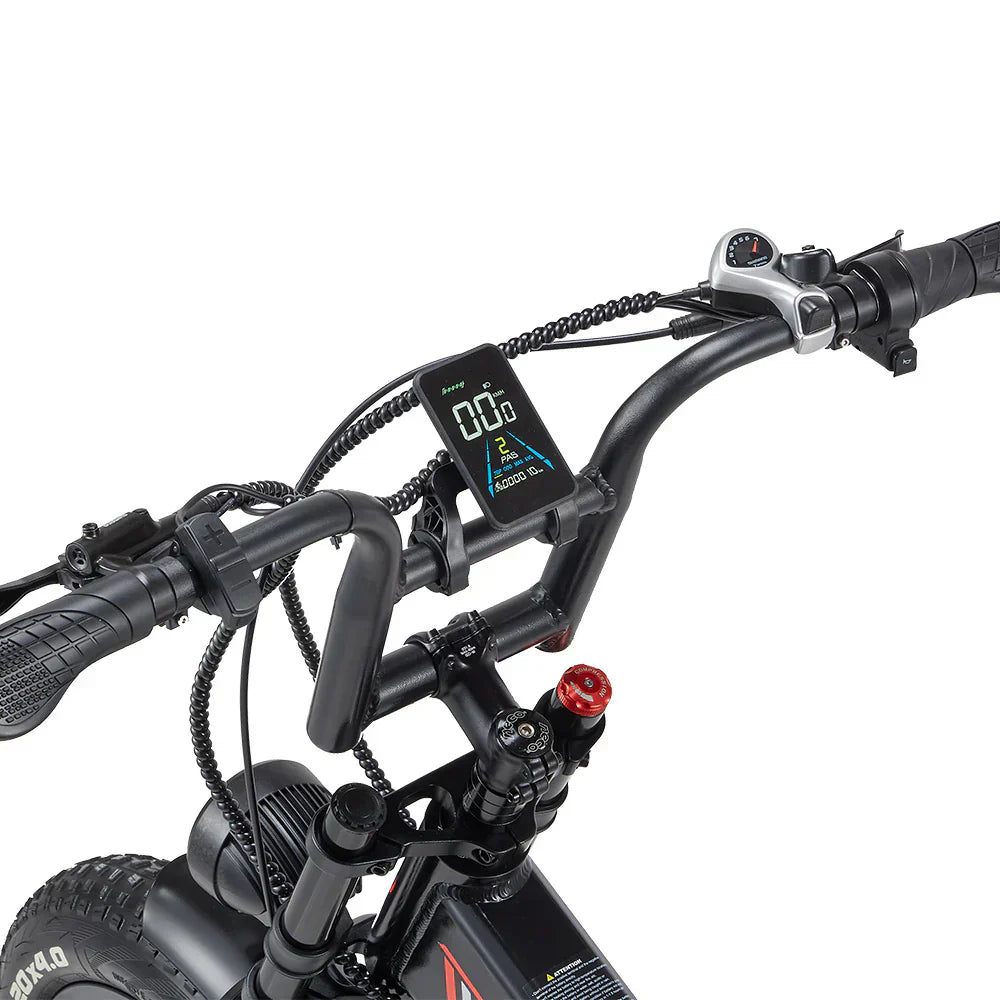 | Specification | Frame: Aluminum alloy Front Fork: Double shock absorption Battery: 48V 20Ah Speed: Shimano 7-Speed Motor: 2*1000W Max Speed: 15.5mph Range: 60km Display: Color LCD display Brake: Hydraulic brakes Max load: 180kg Tire: 20*4.0-inch Charging time: 4-6H Climbing angle: 30° (single drive), 40° (dual drive) |